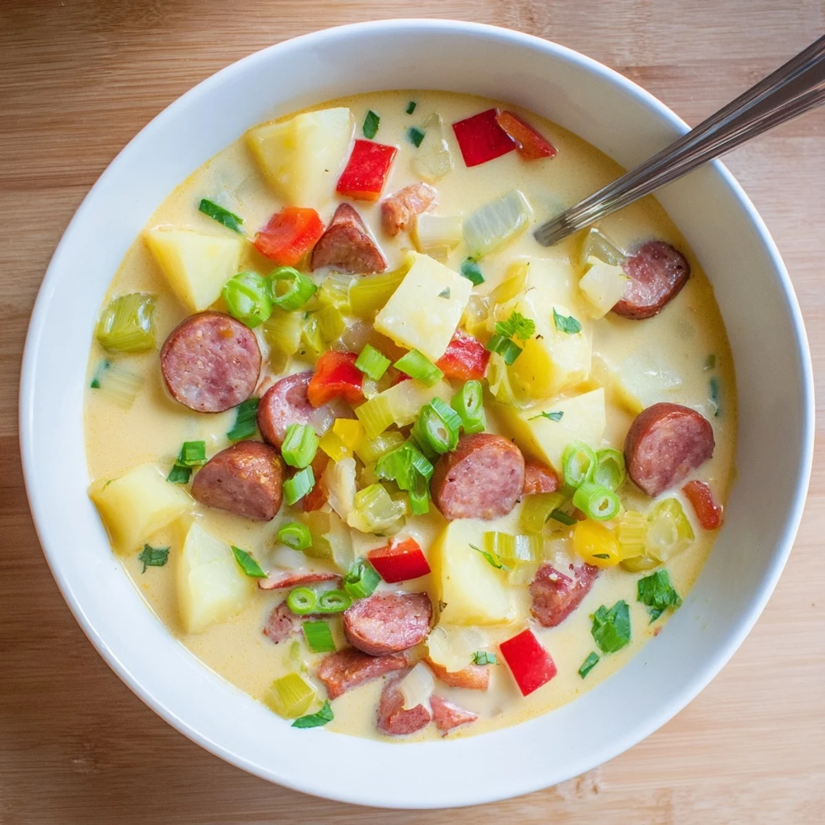 - Use a potato masher or immersion blender to partially puree the soup, leaving some satisfying chunks. Stir in the browned sausage and heavy cream. Simmer uncovered for 5 more minutes to let everything meld.