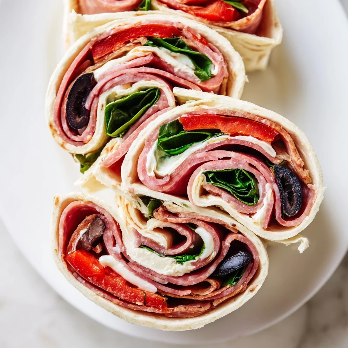 These colorful Italian pinwheel sandwiches combine Genoa salami, pepperoni, and deli ham with provolone cheese, fresh spinach, and roasted red peppers. The cream cheese and herb spread adds zesty flavor while holding everything together inside soft flour tortillas. After a quick chill in the refrigerator, simply slice into spirals and serve.