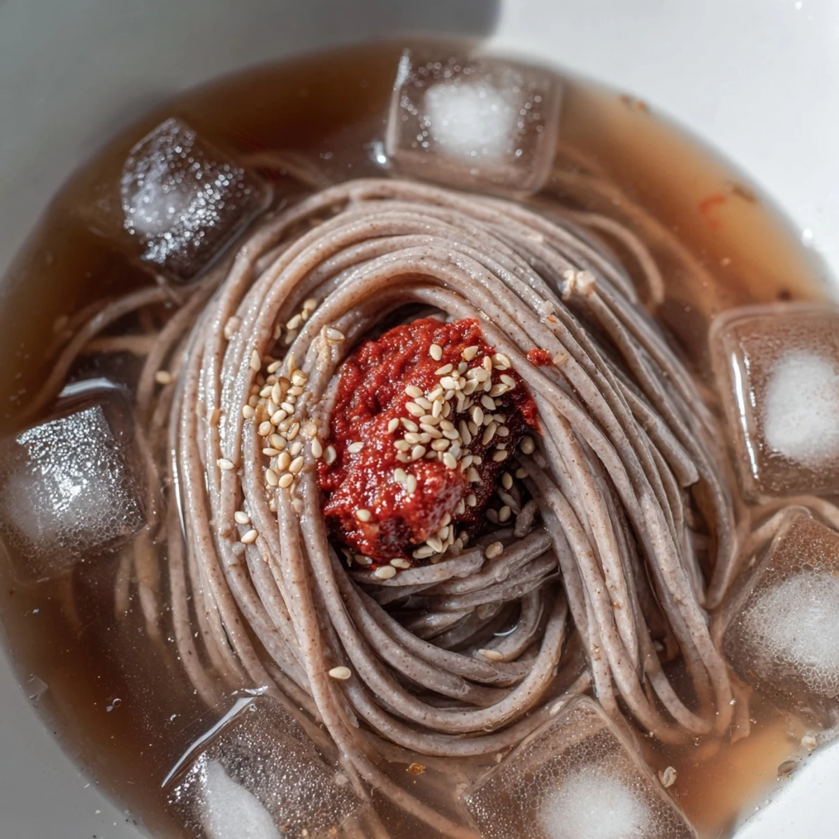 Naengmyeon noodles are made primarily from buckwheat and sweet potato starch, creating an exceptionally chewy and springy texture that holds up beautifully in cold broth. Their distinctive slightly gray appearance and firm bite set them apart from other Asian noodle varieties.