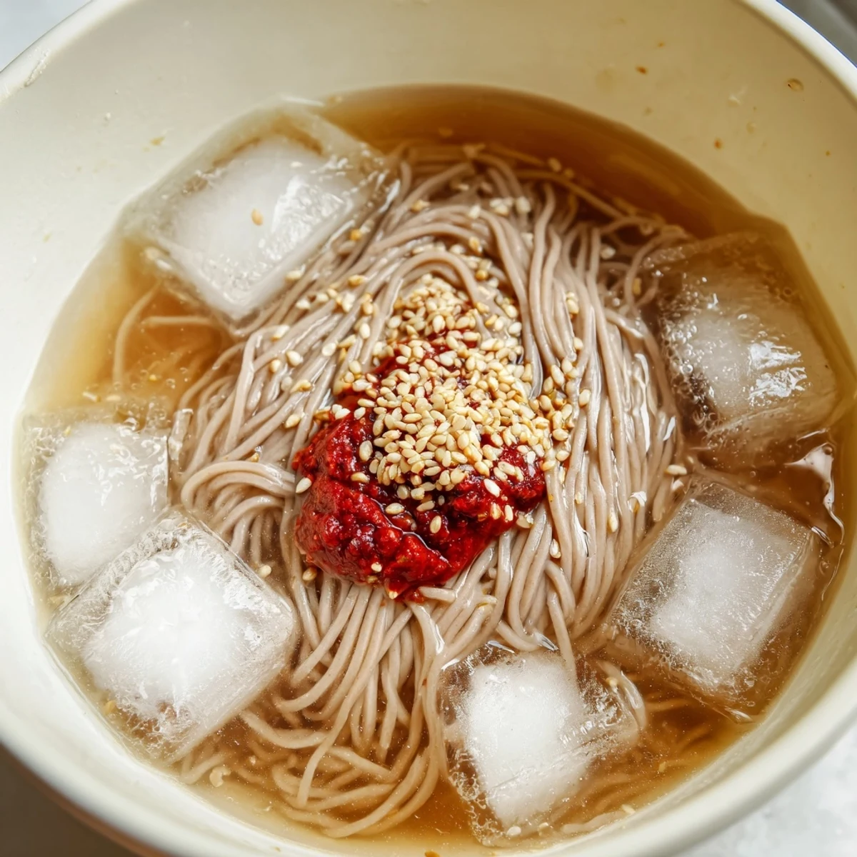 Experience the refreshing flavors of authentic Korean naengmyeon, featuring springy buckwheat noodles submerged in an ice-cold tangy broth. This traditional Korean dish combines the perfect balance of sweet, sour, and savory notes, topped with tender beef brisket, crisp Asian pear, and velvety hard-boiled eggs. The secret lies in the chilled beef-based broth enhanced with rice vinegar and sesame oil, creating a truly cooling sensation ideal for sweltering summer days. Each bowl offers textural contrast from chewy noodles to crisp vegetables, while the ice cubes maintain that signature icy temperature that makes naengmyeon so uniquely satisfying.