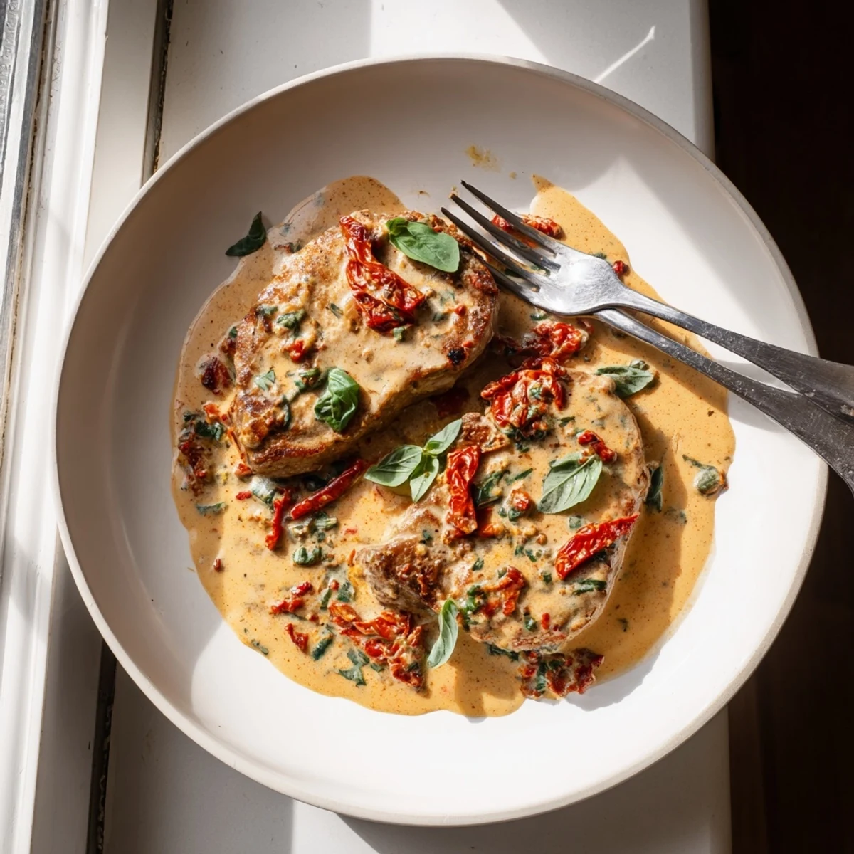 These succulent boneless pork chops deliver restaurant-quality elegance with home-cooking simplicity. Each chop is seasoned and seared until golden, then finished in a velvety sauce made with heavy cream, savory sun-dried tomatoes, and freshly grated parmesan. The Italian herbs and garlic create layers of flavor, while fresh basil adds brightness.