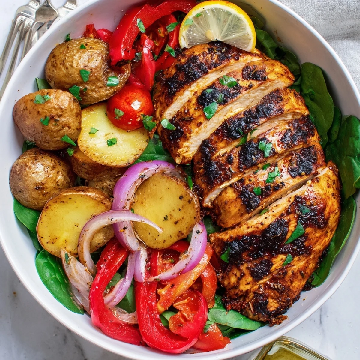 This bowl pairs marinated lean chicken, grilled until juicy, with halved baby potatoes roasted until golden and tender. Roasted peppers, onions and halved cherry tomatoes add sweetness and texture over a bed of spinach. A quick lemony marinade and a short rest keep the chicken moist. Finish with chopped parsley and lemon wedges; swap greens or add chili flakes to vary heat.
