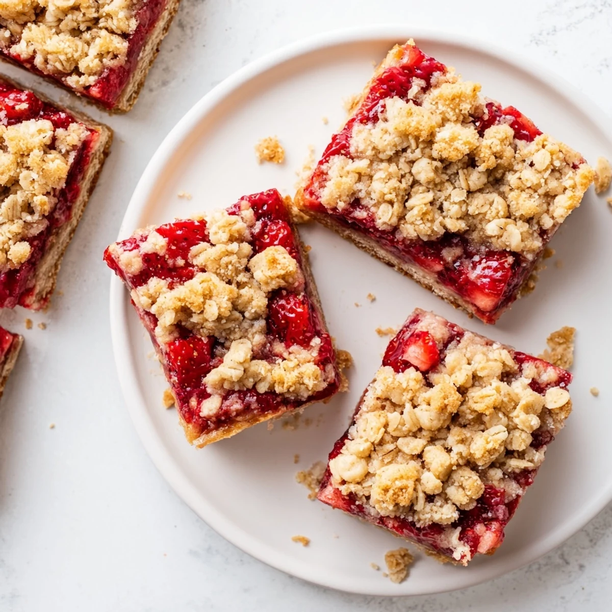 These strawberry oatmeal crumble bars feature a buttery, cinnamon-spiced oat crust pressed into a pan, topped with sweetened fresh strawberries, and finished with a generous layer of crumbly oat topping. The result is a portable treat that balances tender, fruit-filled centers with crispy, golden edges.